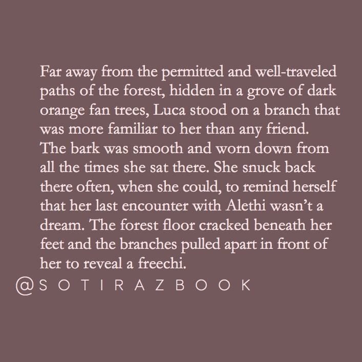 Far away from the permitted and well-traveled paths of the forest, hidden in a grove of dark orange fan trees, I stood on a branch that was more familiar to me than any friend. The bark was smooth and worn down from all the times I sat there. I snuck back there often when I could, to remind myself that my last encounter with Alethi wasn’t a dream. The forest floor cracked beneath my feet and the branches pulled apart in front of me to reveal a freechi.